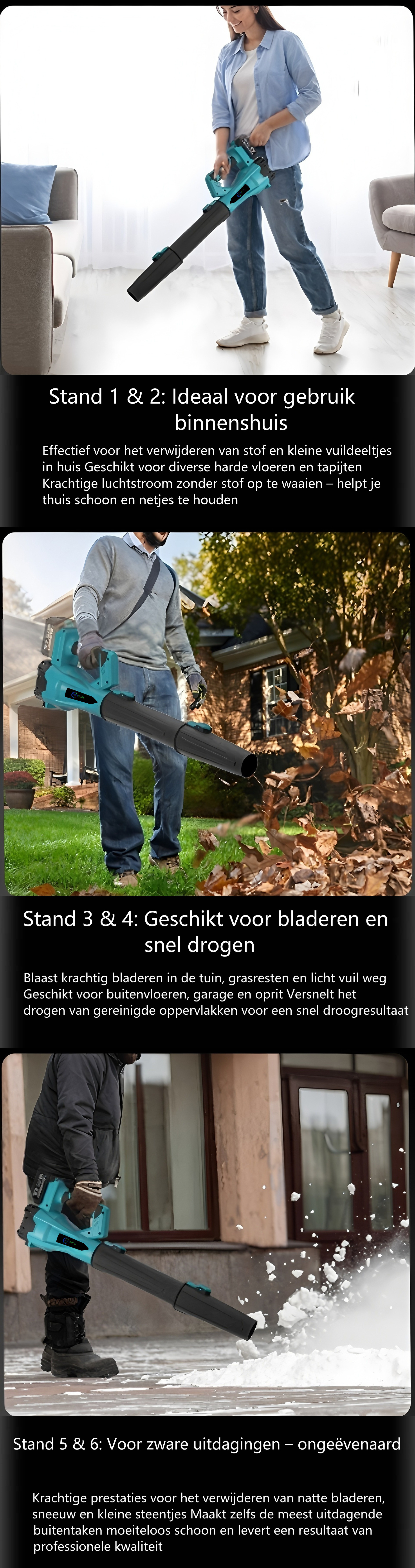 Niveau 3-4: Krachtige reiniging van tuinbladeren en snelle blaasbewegingen voor het drogen van oppervlakken.