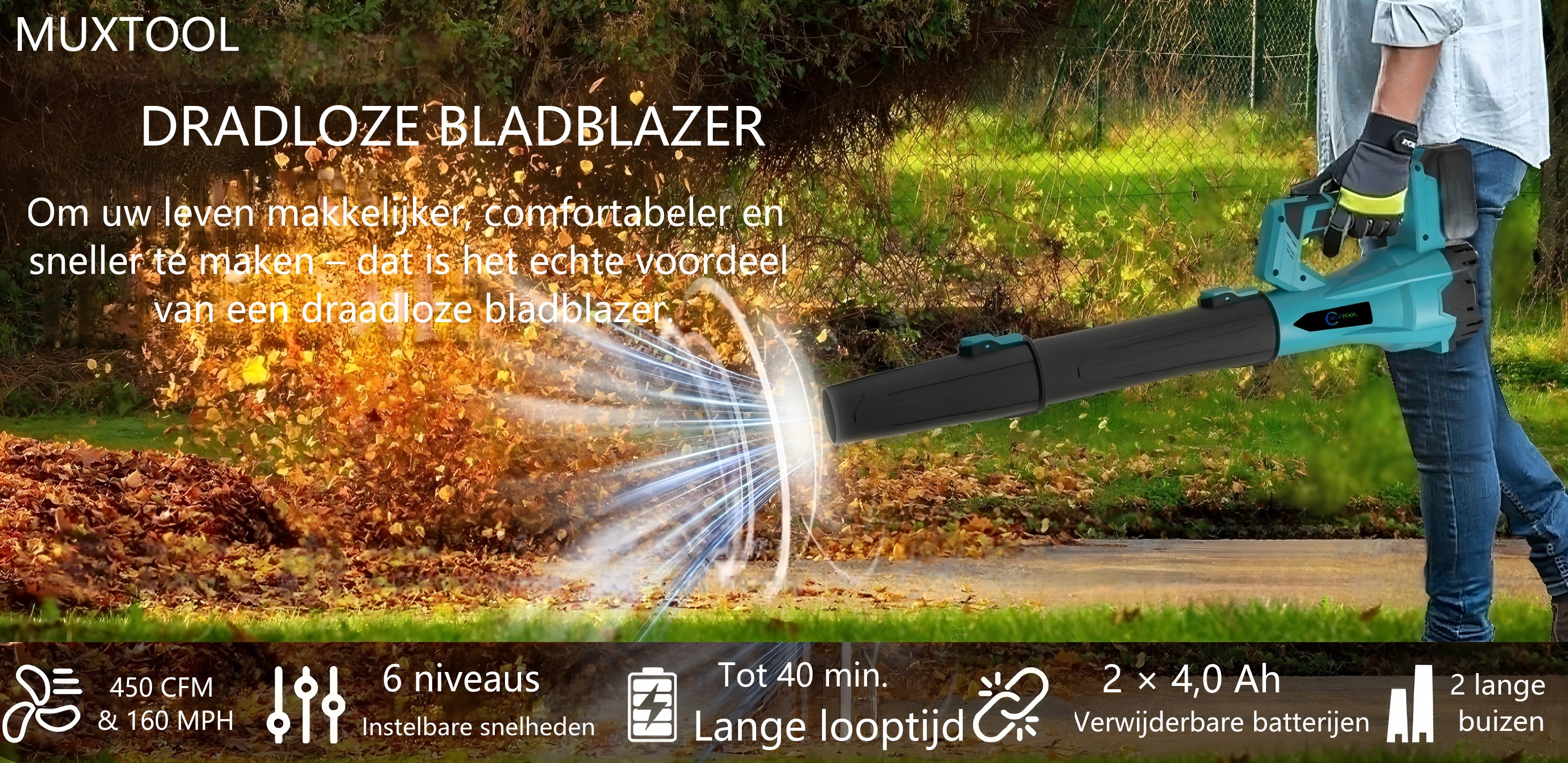 De accu-bladblazers van Muxtool leveren een constante maximale luchtstroom van 450 cfm en een maximale windsnelheid van 160 mph, waardoor u efficiënter kunt werken. Onze accu-bladblazer heeft een geavanceerde motor die 50% stiller is (slechts 75 decibel), waardoor hij perfect is voor gebruik in de vroege ochtend of late avond zonder uw buren te storen.
