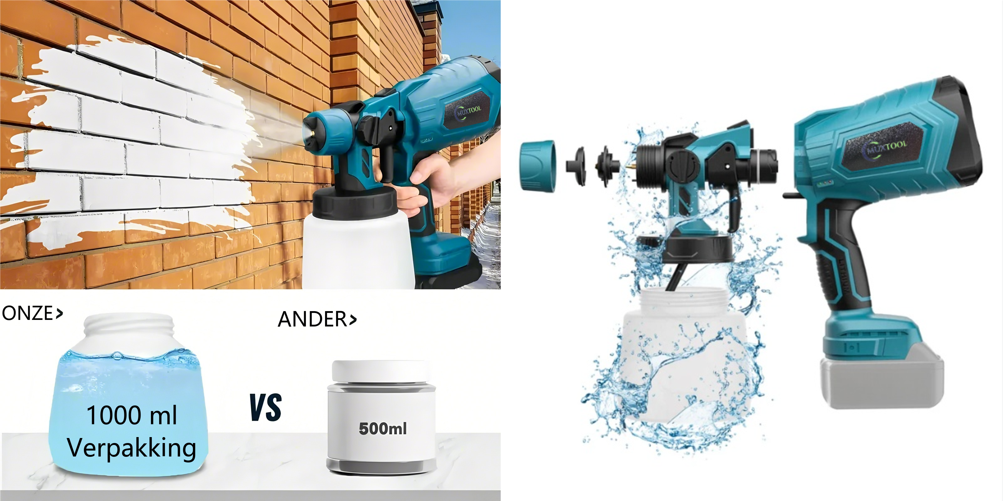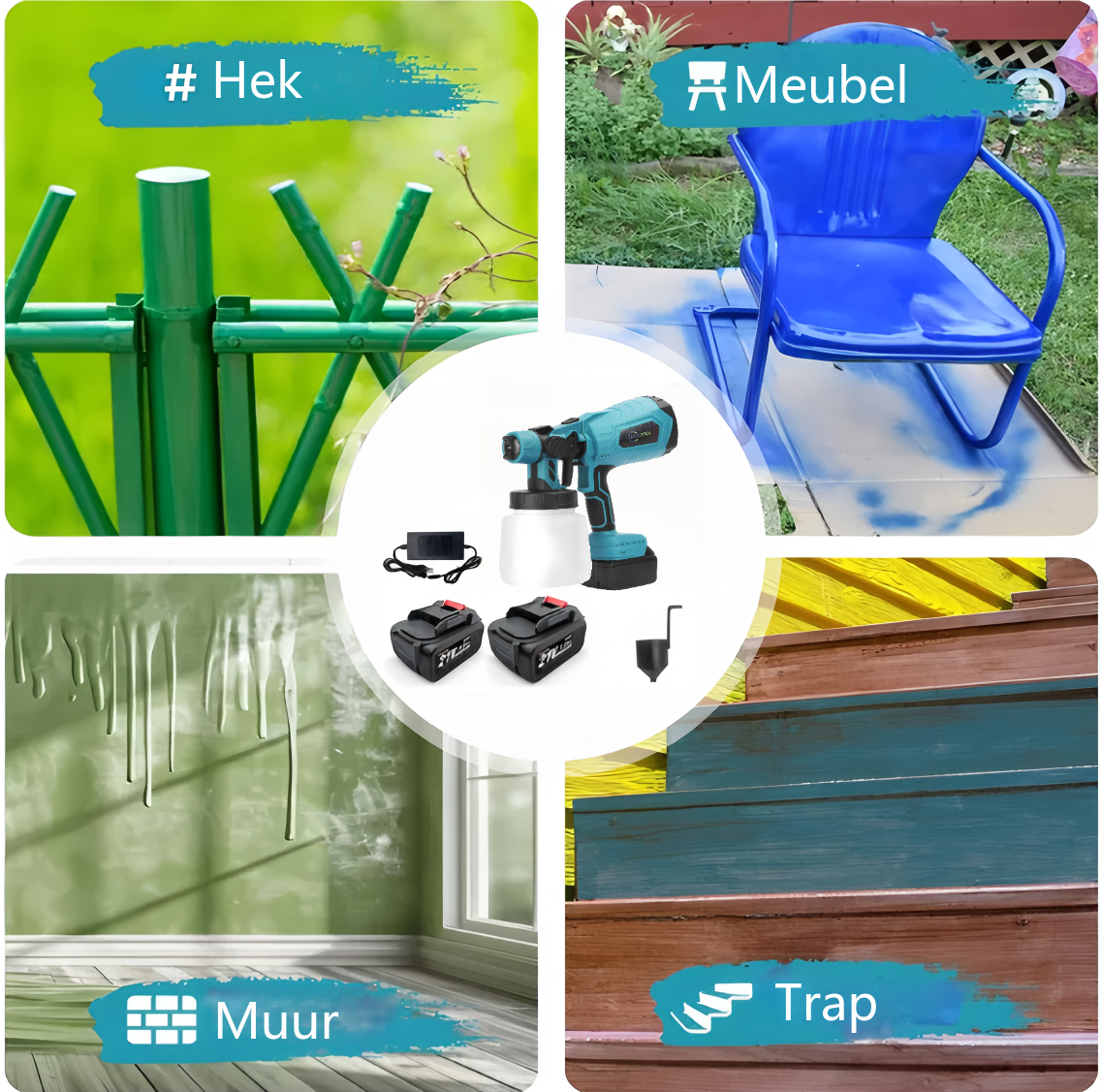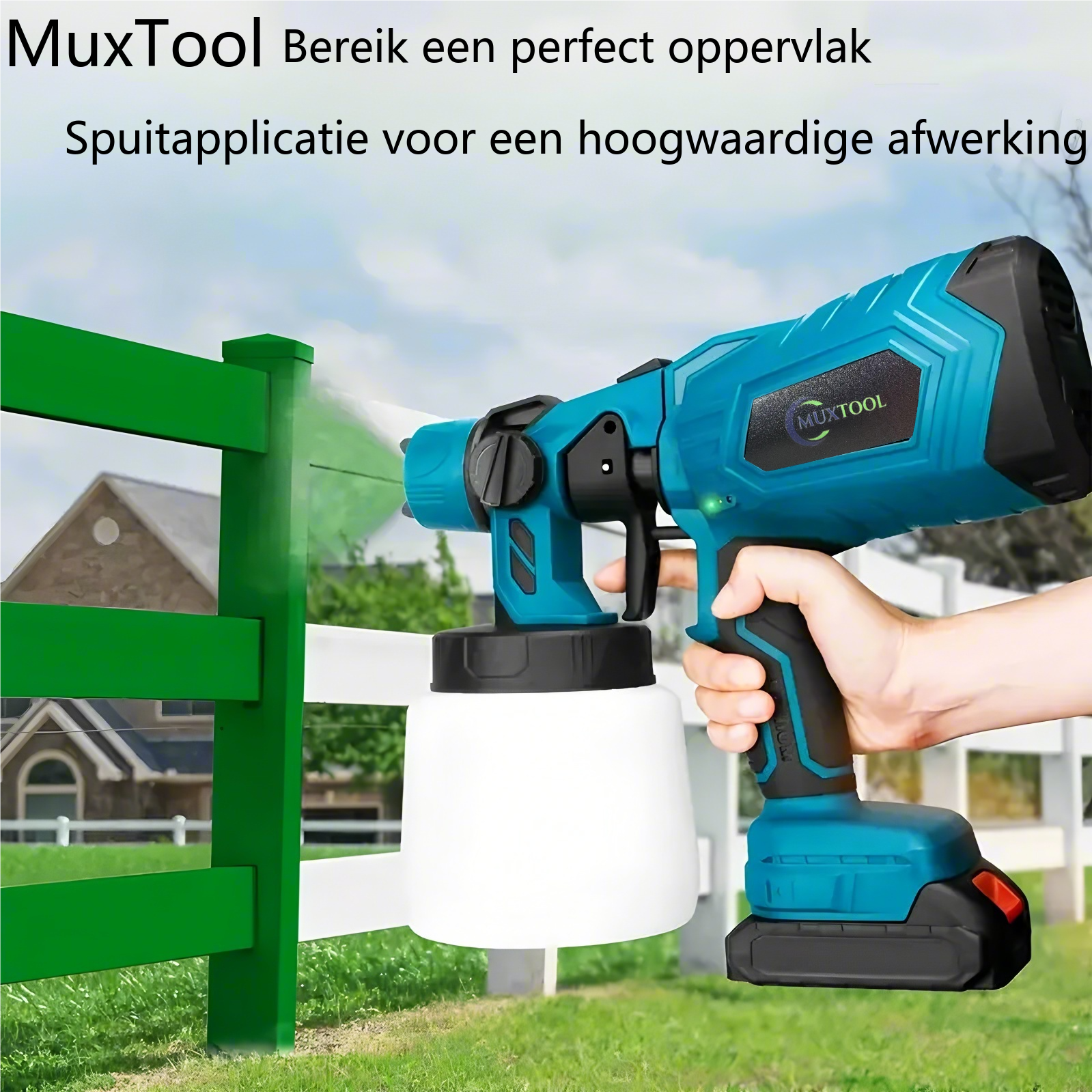 Draadloos verfspuitpistool met 2 accu’s, geschikt voor doe-het-zelfprojecten zoals het schilderen van huizen, meubels en afsluitingen.