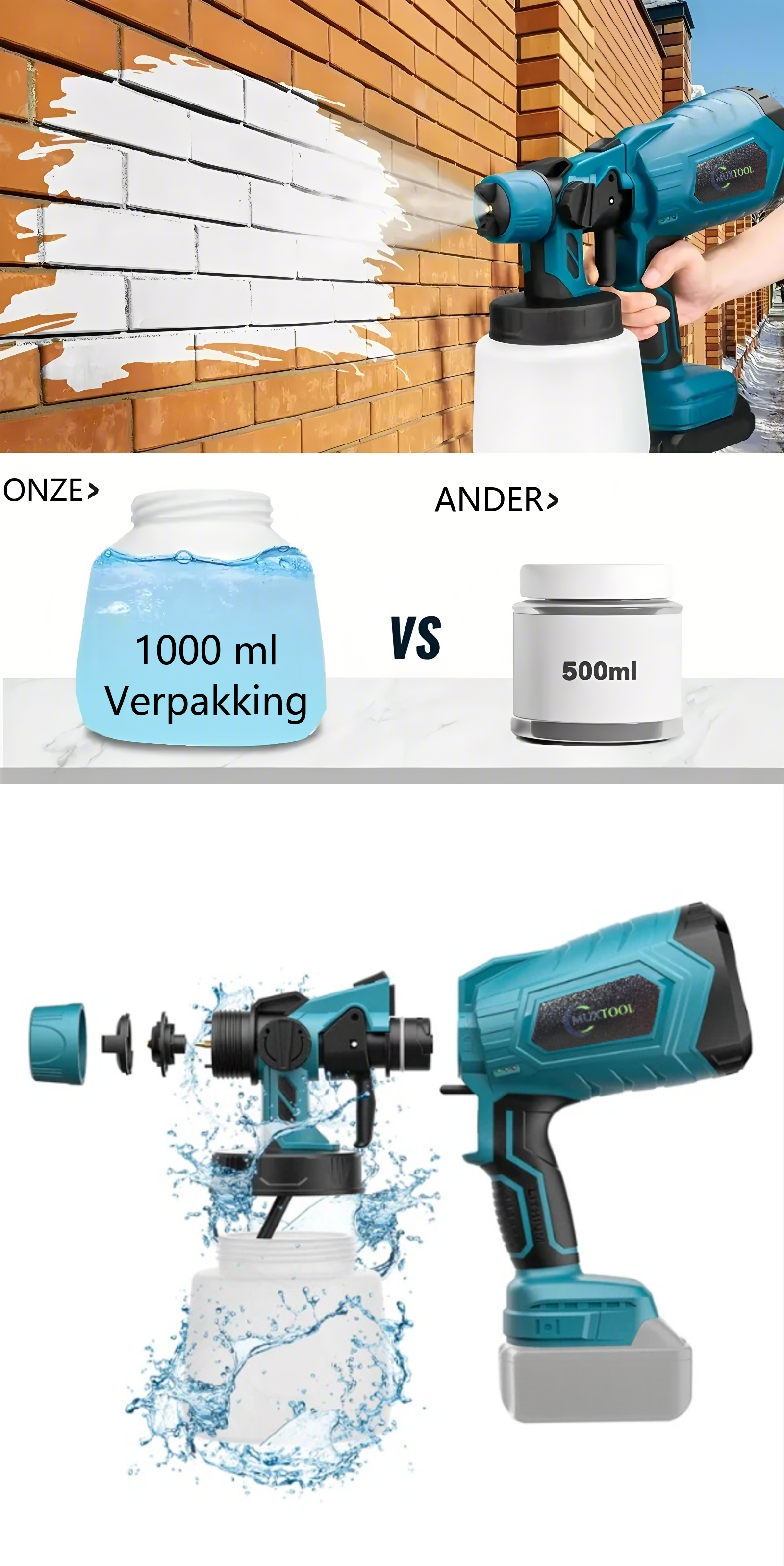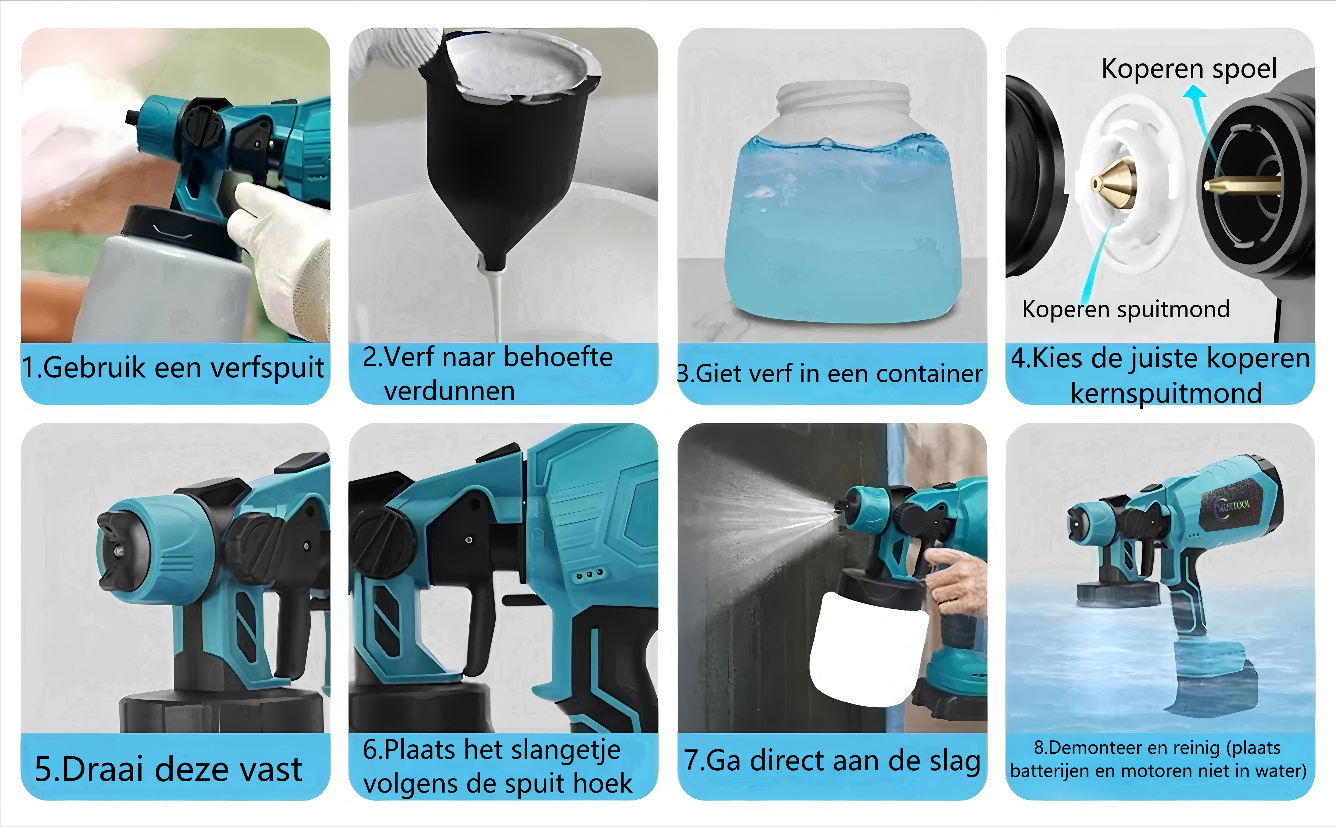 De verfspuitpistool moet onmiddellijk na gebruik worden gereinigd om te voorkomen dat verf opdroogt in de spuitkop en het systeem blokkeert. Vul de container met schoon water en spuit gedurende 30–60 seconden om verfresten uit de spoeleenheid te verwijderen, en reinig vervolgens grondig!